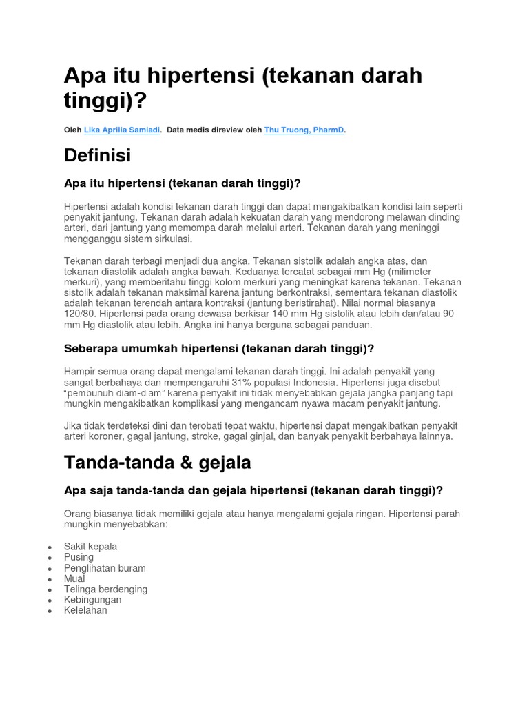 Tetapi perlu diketahui bahawa majoriti daripada. Assamualaikum ,.hipertensi atau tekanan darah tinggi adalah penyakit senyap yang boleh membawa kepada komplikasi dan juga kematian jika tidak dirawat.tanda. Tekanan darah dikira melalui berapa banyak darah yang melalui salur darah dan berapakah rintangan darah tersebut ketika jantung mengepamnya. Tanda lain dari penyakit tekanan darah tinggi adalah munculnya titik darah pada bola mata. Hipertensi atau tekanan darah tinggi dapat dideteksi dari beberapa tanda atau gejala.