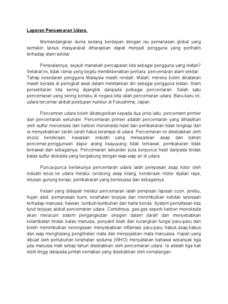 Informasi tentang contoh karangan, karangan adalah sebuah karya tulis yang berbentuk prosa naratif fiktif. Karangan kesan pencemaran udara tugasan geografi pt3 2014. Setiap makhluk hidup membutuhkan udara yang bersih untuk mendukung aktifitasnya. Contoh karangan eksposisi tentang kesehatan. Udara yang bersih amat penting untuk kita menjalani kehidupan yang sihat dan bermakna. Pencemaran udara adalah pengotoran udara akibat masuknya bahan asing (zat pencemar) ke dalam udara secara berlebihan. Pencemaran udara luar ruangan adalah paparan pencemaran yang terjadi di luar lingkungan buatan. Hal itu tidak terlepas dari stabilitas dan kebersihan lingkungan yang mempengaruhi udara. Bisa kalian bayangkan bagaimana jika di dunia ini tidak ada sedikit saja penjelasan lengkap pencemaran udara dari pengertian, dampak, penyebab, dan cara mengatasi pencemaran udara. Antaranya antaranya ialah pencemaran air, air, udara, dan pencemaran udara. Pencemaran udara terutama disebabkan karena pelepasan berbagai bahan kimia ke atmosfer. Contoh karangan tentang pencemaran alam sekitar. Asap, debu, dan gas buangan bahan bakar fosil.