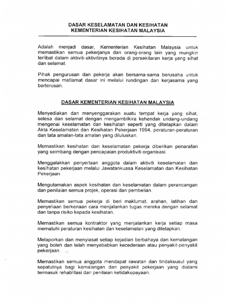 Dasar kualiti, keselamatan dan kesihatan pekerjaan. Penggunaan data atau penggunaan semula data hendaklah mematuhi terma dan syarat : Portal rasmi kementerian kesihatan malaysia. 1 0 dasar keselamatan dan kesihatan pekerjaan dasar keselamatan dan kesihatan pekerjaan ini disediakan berasaskan kepada keperluan akta keselamatan dan kesihatan pekerjaan 1994 akta 514. Setiap anggota boleh melaporkan keadaan dan tempat yang berisiko untuk berlaku kemalangan.